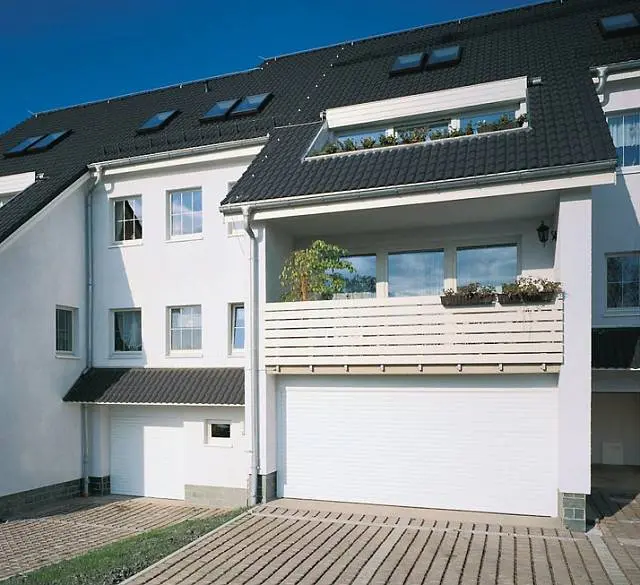 Короб ворот располагается внутри проема. Благодаря этому на фасаде нет выступающих элементов.
