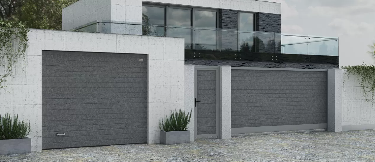Неповторимый вид воротам придает комбинированное заполнение, которое позволяет сочетать между собой сэндвич-панели, алюминиевый и роллетный профили в различных вариациях.