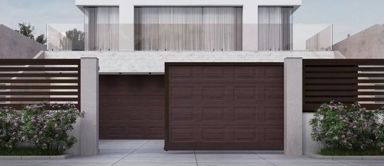 Заполнение из сэндвич-панелей с рисунками микроволна, филенка, S, L, M‑гофр толщиной 45 мм и двухслойным полимерным покрытием с возможностью покраски в любой цвет по карте RAL.